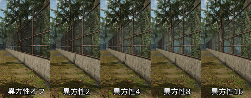 3Dモデルに張り付ける「絵」のクオリティが変化する。ゲームの実装にもよるが低設定では気になることがあるかもしれない。負荷はまあまああるのでクオリティとフレームレートのバランスをうまくとってほしい。
