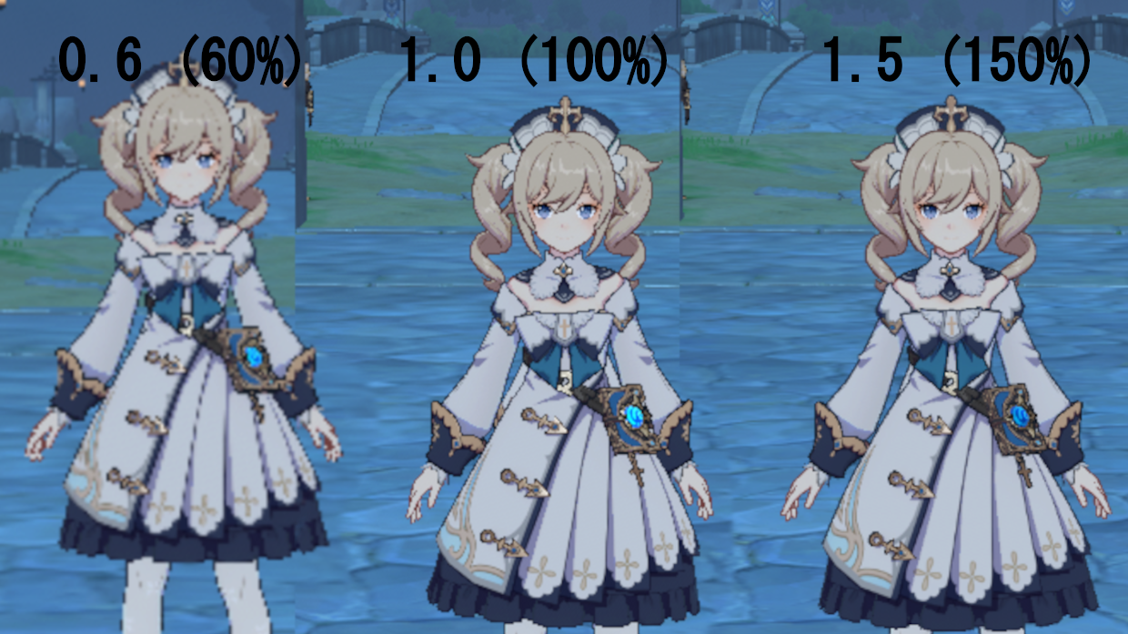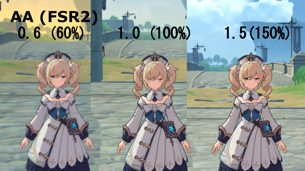 レンダリング精度はほぼすべてのゲームに設定項目があるといっても過言ではないぐらいどのゲームにある項目だ。画像を見てもらうとわかる通り、3Dオブジェクトの精度、細かさを左右する。ゲームによっては100%を超える数値が選べる場合もある。大きな違いを生むだけあってその負荷は極大であり、後述するアンチエイリアスを併用して調整する場合が多いだろう。