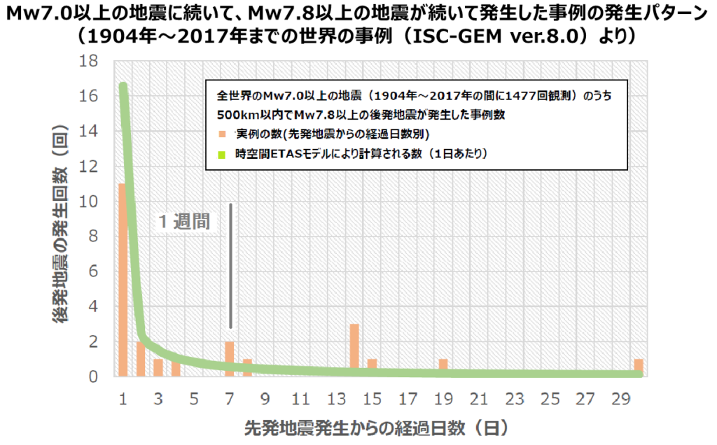 Mw7.0以上の地震発生後7日以内にMw8クラス以上(Mw7.8以上)の後発地震が発生する確率は、概ね百回に1回程度(Mw8.0以上の地震発生後にMw8クラス以上の後発地震が発生する確率は、概ね十回に1回程度)です。Mw7.0以上の地震発生後、平常時に比べるとMw8クラス以上の地震発生の可能性は相対的に高まっていると考えられますが、1週間のうちに後発地震が必ず発生するわけではないことに留意が必要です。