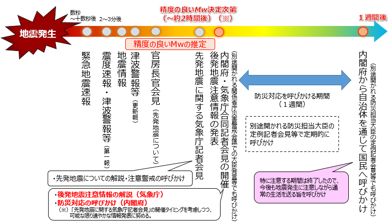 気象庁において一定精度のMwを推定(地震発生後15分~2時間程度)し、情報発表基準を満たす先発地震であると判断でき次第、「北海道・三陸沖後発地震注意情報」の発表と内閣府・気象庁合同記者会見が行われます。